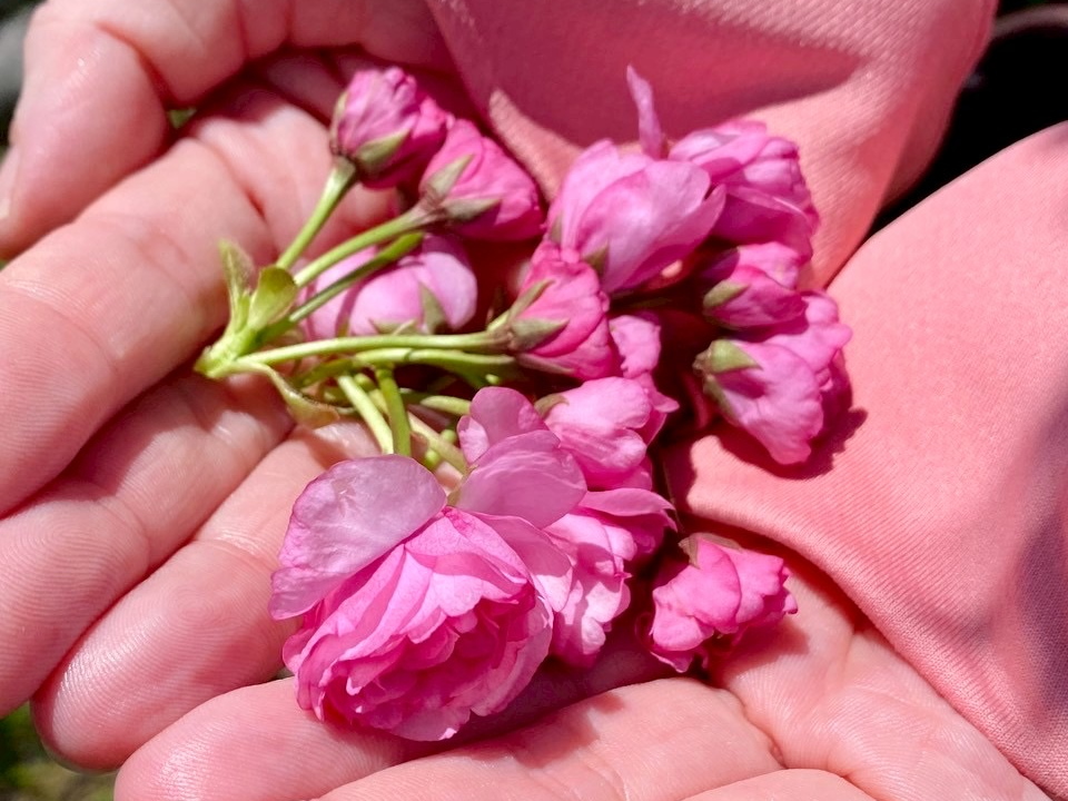 2025年からは地元の農家さんに八重桜の木をご提供いただき、花摘みボランティアの皆さんのご協力のもと、抽出に使用する花の一部を集めています。